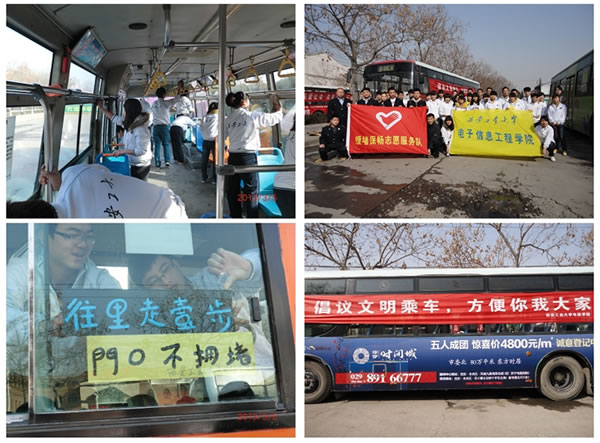 10名学生负责一辆车,按照公交公司的清洁标准,打扫了进站的每一辆公交车。志愿服务的同时也帮助保洁阿姨减轻了负担。志愿者们充分发挥了不怕累不怕脏把欢乐和美好给他人的精神。较好的展示了当代大学生的风采。当车进站后积极主动地做清洁。休息时不大声喧哗追逐打闹,不影响工作人员的工作。宣传部干事将写有“往前走一步,门口不拥堵”、“你排我排大家排,你快我快大家快”等标语贴在车窗,提示乘客文明乘车,此举得到了公交公司人员的大力支持,希望可以写更多的标语,倡议文明乘车方便你我大家。
