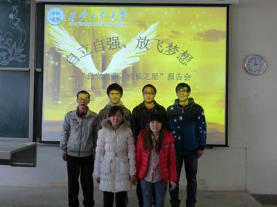 代表分别上去讲述他们那些自立自强的故事,他们都有不同的故事,不一样的经历,但他们对待困境的勇气和态度却是相同的。他们感染了在场的所有人,都为他们鼓掌呐喊,相信他们是大家学习的榜样。最后由主持人宣布会议结束,老师代表和学生合影留念。